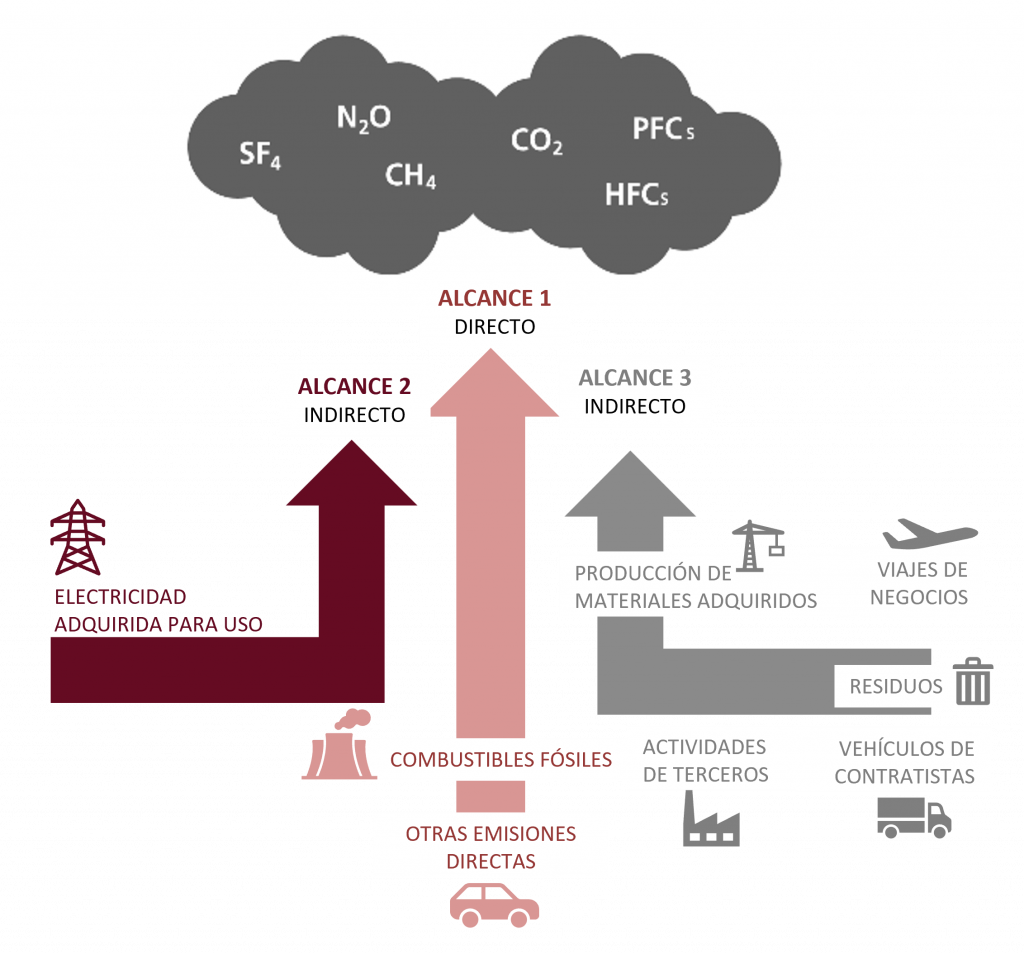 - Alcance 1: emisiones directas de GEI. Por ejemplo, emisiones provenientes de la combustión en calderas, hornos, vehículos, etc., que son propiedad de o están controladas por la entidad en cuestión. También incluye las emisiones fugitivas (p.ej. fugas de aire acondicionado, fugas de CH4 de conductos, etc.).